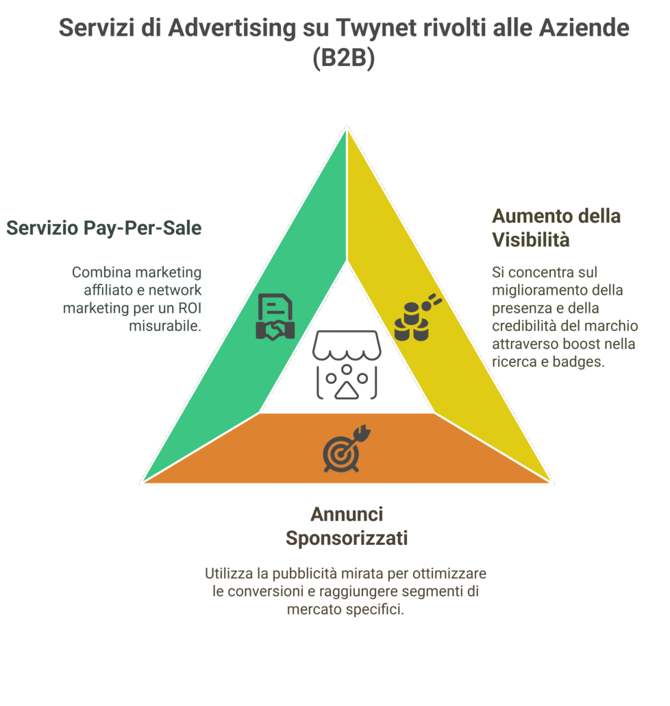 Le aziende che operano su Twynet possono combinare più strategie di monetizzazione, bilanciando investimenti in advertising, vendite e gestione del network marketing per ottenere il massimo ritorno economico.