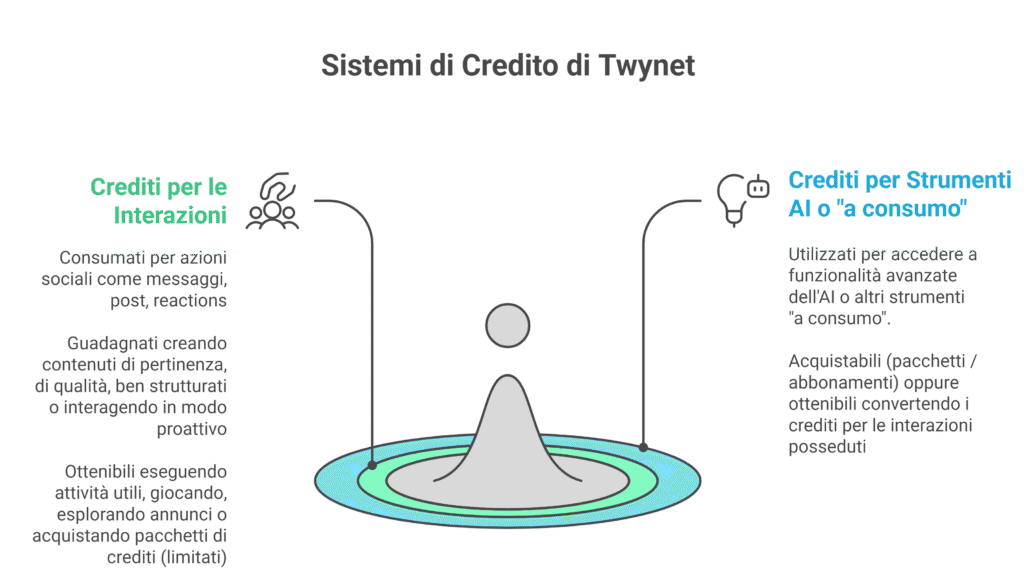 Twynet è una piattaforma social a pagamento e utilizza due sistemi di crediti separati, ma interconnessi, per favorire interazioni di qualità ed utilizzo degli strumenti di AI o di marketing automation. Un uso free di base è comunque possibile attraverso crediti gratuiti mensili.