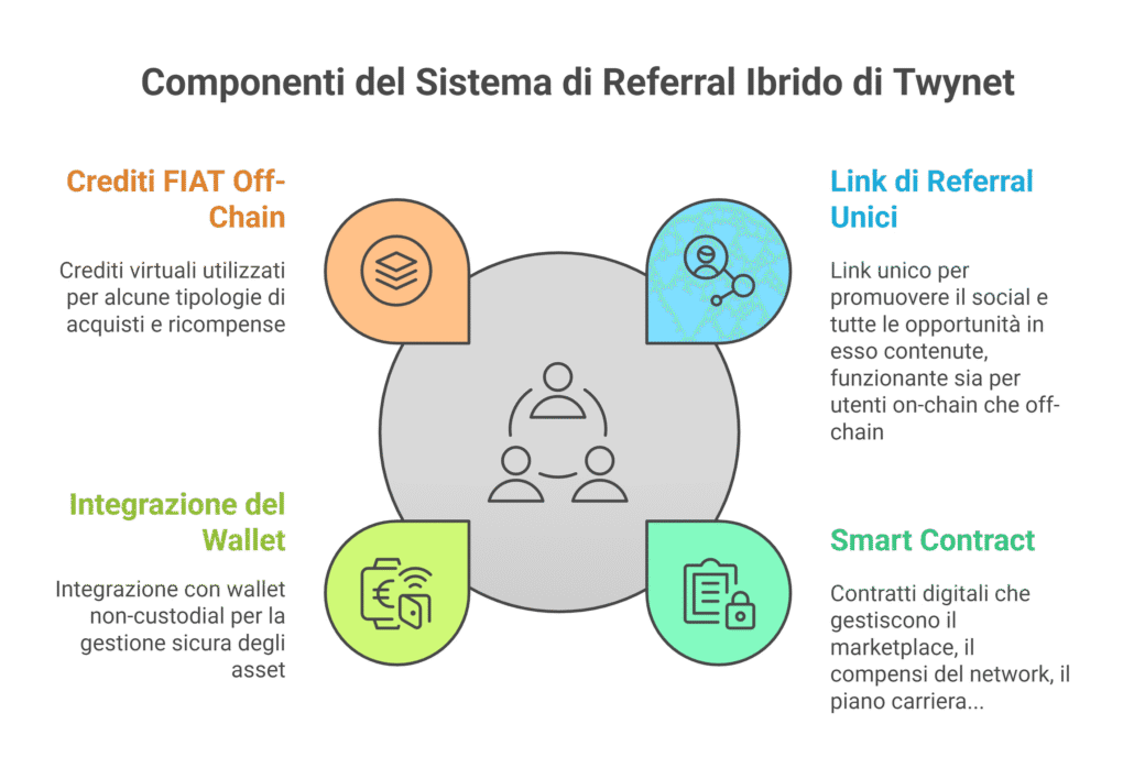 Il sistema di referral ibrido di Twynet combina tecnologie off-chain e on-chain per integrare funzionalità avanzate di network marketing e sharing economy. Questa soluzione consente agli utenti di partecipare a diversi livelli di coinvolgimento, con un’architettura flessibile e scalabile.