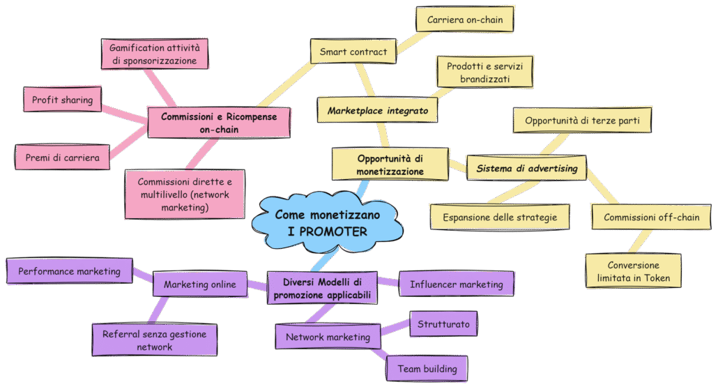I promoter professionisti, registrati on-chain e con un abbonamento “Promoter” attivo, basano la loro strategia di monetizzazione sulla promozione tramite referral, guadagnando commissioni e ricompense in base alle attività svolte.